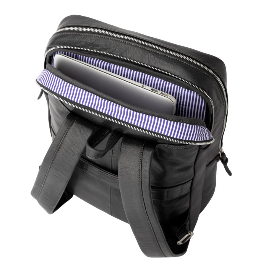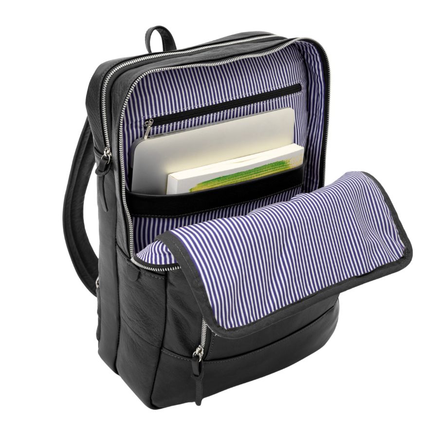 Interior: two high-capacity compartments — the rear compartment is specifically designed for your laptop up to 17’’, giving you quick, direct access without digging through the backpack; the main compartment also includes a padded sleeve for a laptop or documents, plus generous space for folders, tech devices, headphones, a change of clothes, and other essentials. Lined with our iconic striped fabric, combining softness and elegance in every detail.