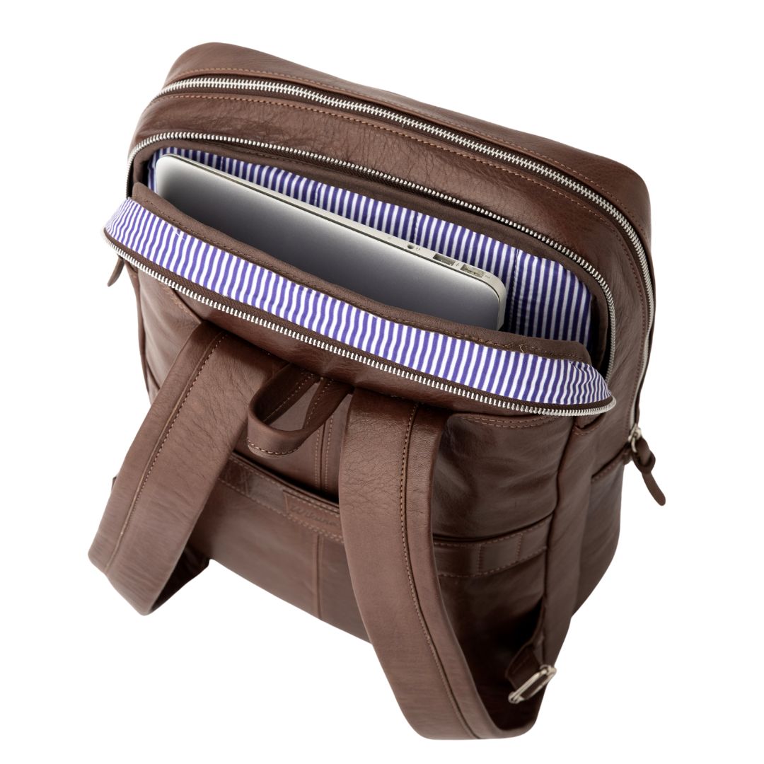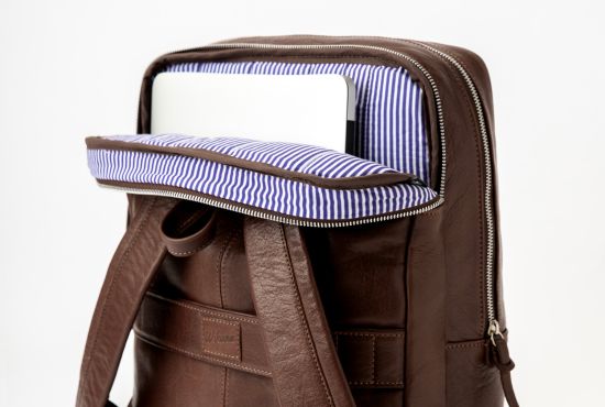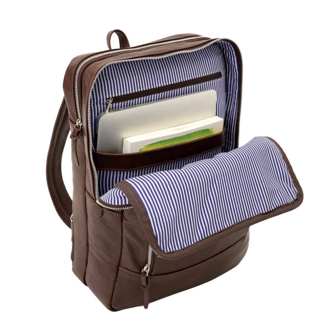 Interior: two high-capacity compartments — the rear compartment is specifically designed for your laptop up to 17’’, giving you quick, direct access without digging through the backpack; the main compartment also includes a padded sleeve for a laptop or documents, plus generous space for folders, tech devices, headphones, a change of clothes, and other essentials. Lined with our iconic striped fabric, combining softness and elegance in every detail.